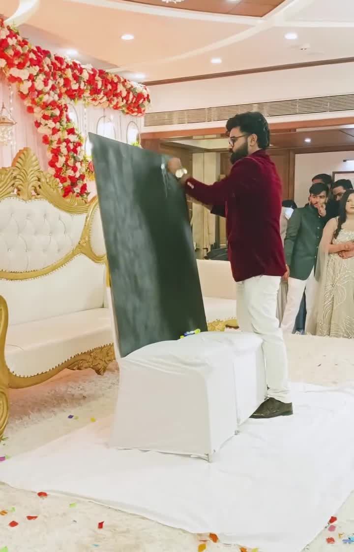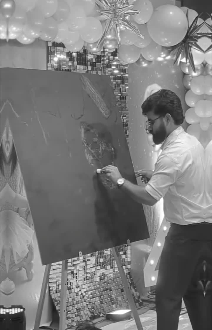 This is pure stage magic. I paint a portrait or logo on a black canvas using a special invisible glue. The image remains a secret until the final moment, when I throw glitter onto the canvas to instantly reveal the artwork. It’s the perfect high-impact reveal for weddings, birthdays, and corporate logo launches.