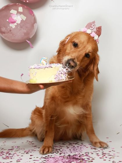 I adore celebrating your pet's big days, from first birthdays to gotcha-day anniversaries. My sessions include fun themes like dog cake smashes with pet-safe cakes, confetti explosions for that perfect party shot, or even a relaxed picnic setup to mark the occasion.
