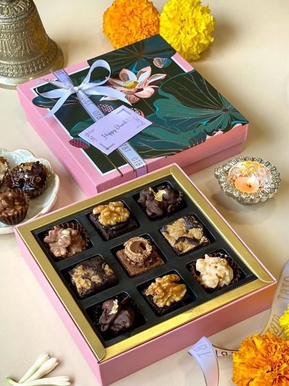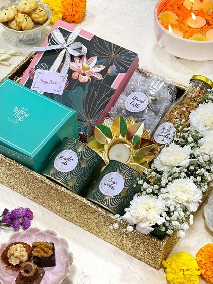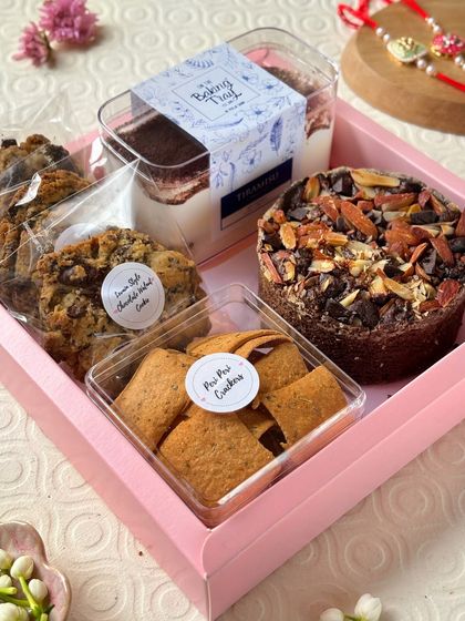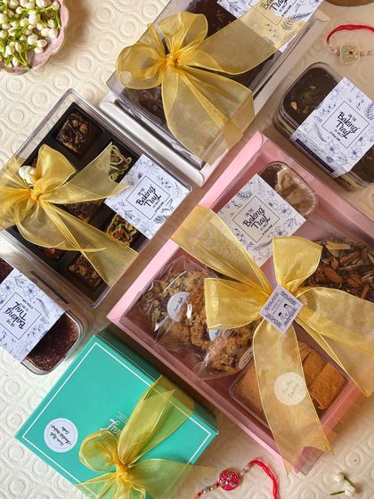 I make eggless gift hampers myself with homemade desserts, snacks, and festival extras, packed in premium boxes for any occasion.