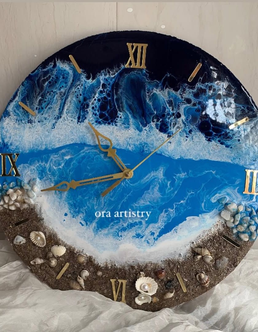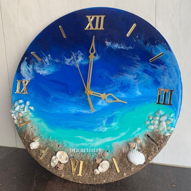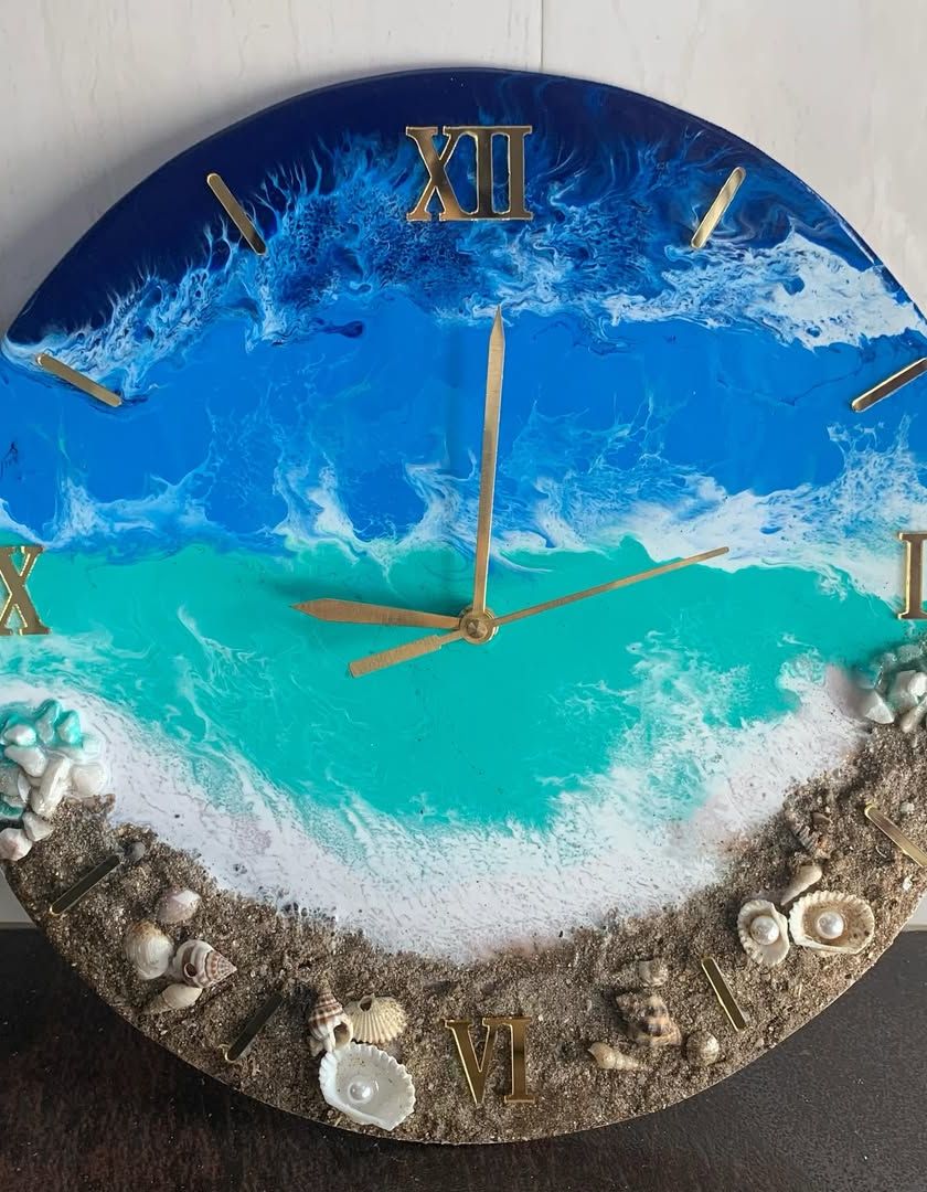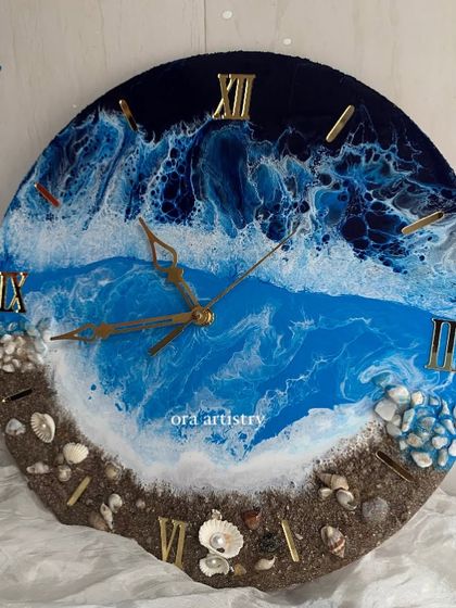 Capture the calming beauty of the sea with my ocean-themed resin art. In my workshops, you'll learn to create realistic waves, sandy beaches with real shells, and deep blue water effects on wall clocks, coasters, and more.