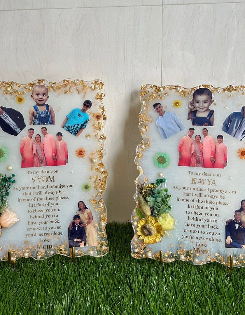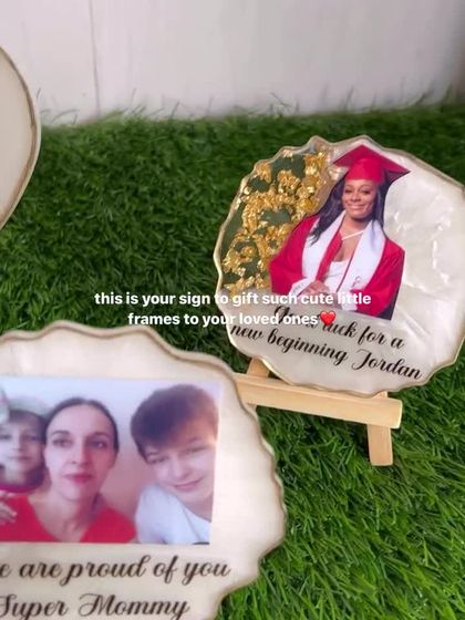 I preserve your most precious moments in custom resin frames. These are perfect for commemorating milestones like anniversaries, birthdays, or new beginnings, and can be personalized with photos, quotes, and decorative elements like dried flowers and gold leaf.