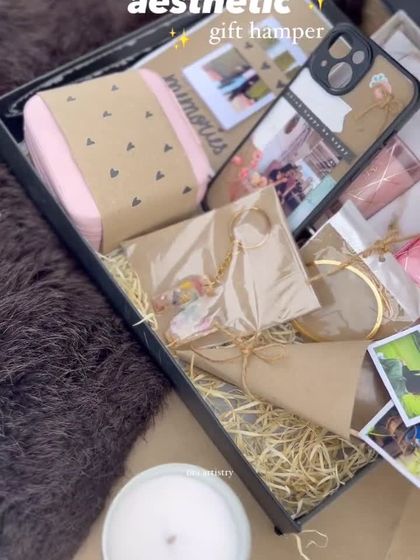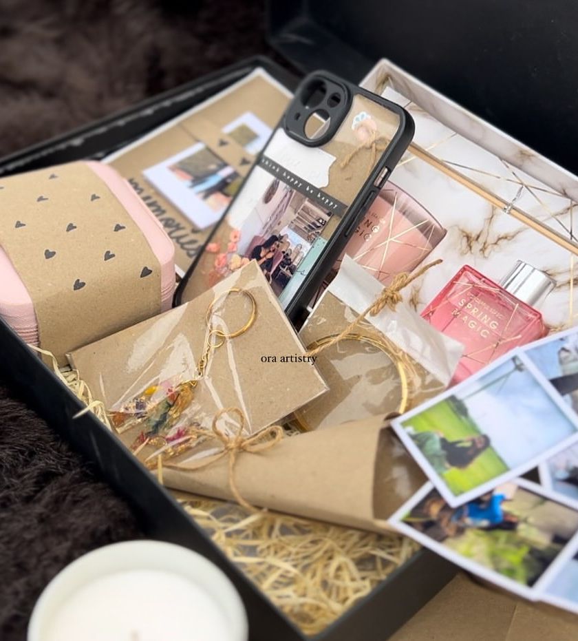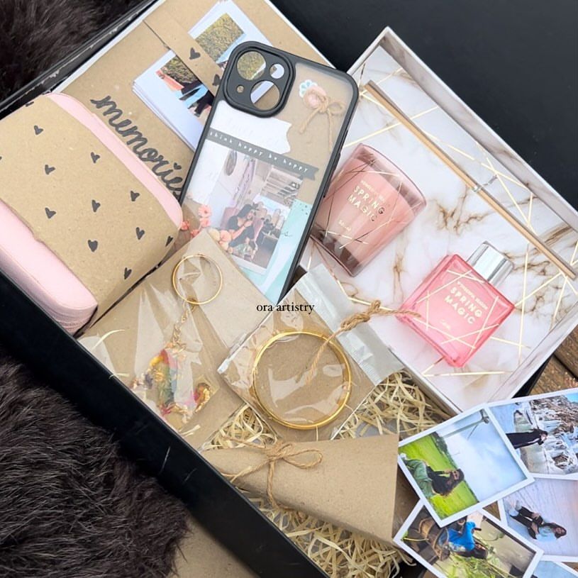 This is my signature service, the fully curated, handmade gift hamper. Each box is a complete celebration, combining personalized items like photo bouquets and resin keychains with practical gifts like scented candles and jewelry organizers, all styled with a Pinterest aesthetic.