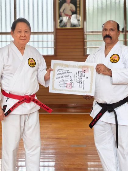 Started back in 1992 with just 14 folks, now we’re teaching 50,000+ every year—pretty wild, right? All thanks to our students, teachers, and supporters. My Okinawa teachers shaped everything I know. We keep going back there, always learning. Got my Kyoshi Nanadan (7th Dan) recently, which is huge for me. For us, karate isn’t just sport—it’s about making people strong and safe. Like Sensei Nagamine said, 'Mada tarinu. Kitae konashite.' (It’s still not enough. Train hard.) That’s our vibe.
