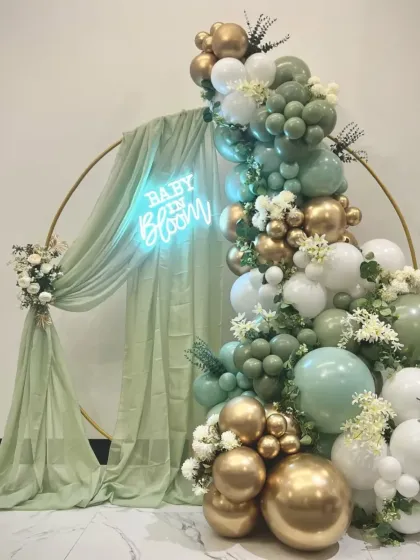 - Baby shower balloon garland setups with neon signs and those big “B-A-B-Y” boxes everyone loves.