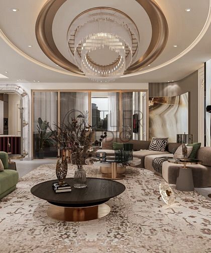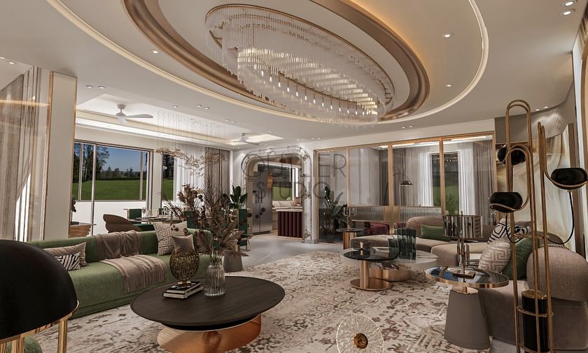 I design living and dining areas that are grand in scale and rich in detail, serving as the heart of the home. These spaces often feature double or triple-height ceilings, statement chandeliers, and a curated palette of materials like marble, veneer, and metal to create an atmosphere of sophisticated comfort.