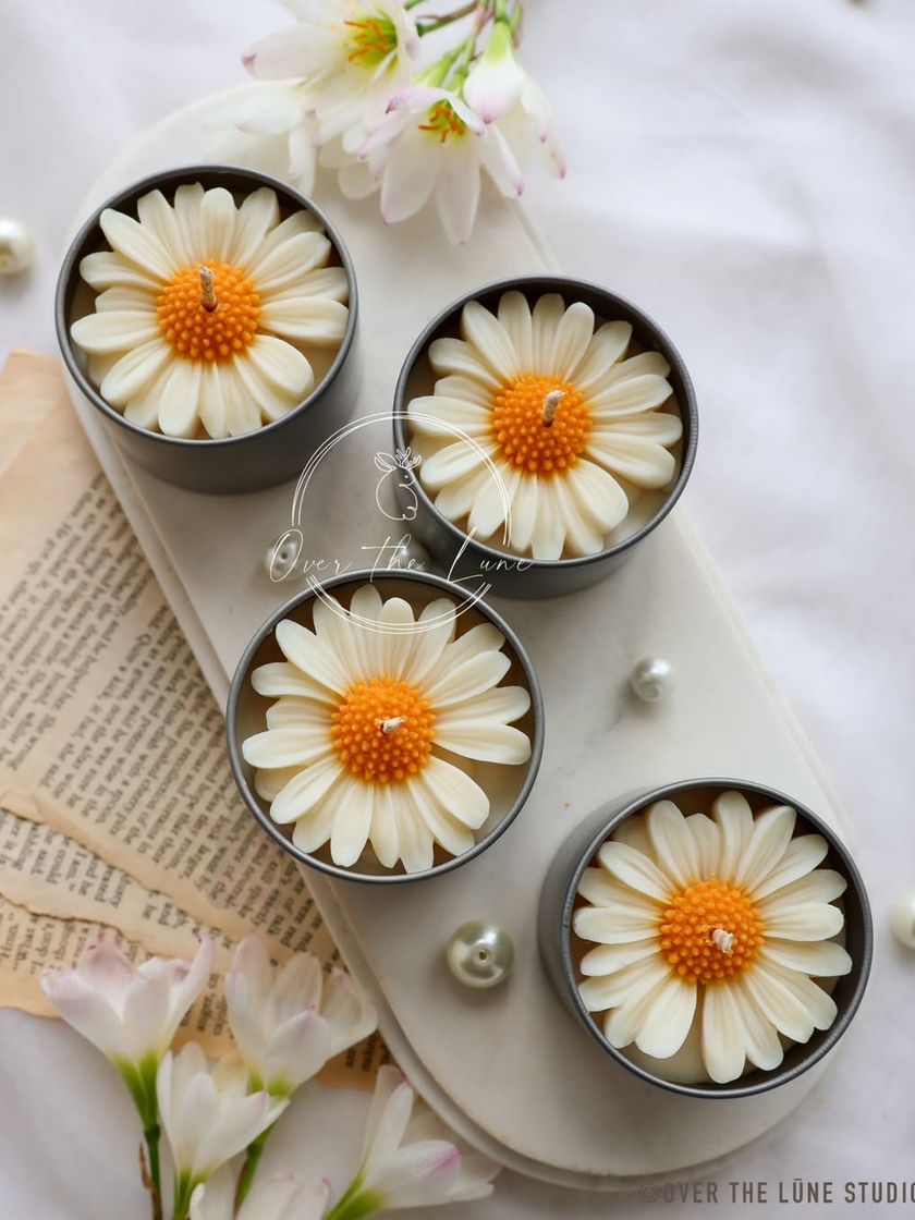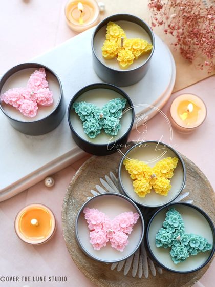 My collection of jar and tin candles are perfect for easy gifting and everyday decor. I hand-pour each one with scented soy wax and top them with intricate designs, including colorful daisies, whimsical butterflies, and unique limited edition creations.