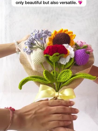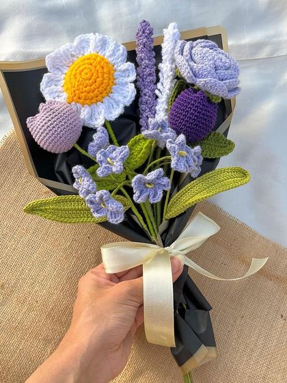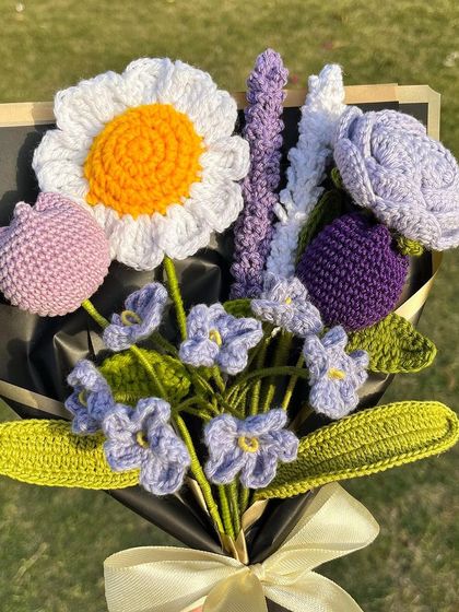 We craft handmade crochet flowers and bouquets, including tulips, sunflowers, daisies, roses, lilies, and forget-me-nots. Each piece features intricate craftsmanship with options for LED lights and custom color schemes.