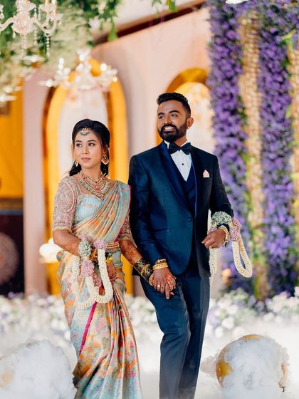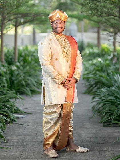 I design custom South Indian groom outfits like silk dhoti sets, embroidered kurtas, and sherwanis, with options for personal embroidery and matching couple wear for all wedding events.