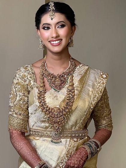 I specialize in creating bespoke bridal ensembles that blend South Indian traditions with contemporary designs. Each piece features intricate embroidery, luxurious fabrics, and meticulous attention to detail.