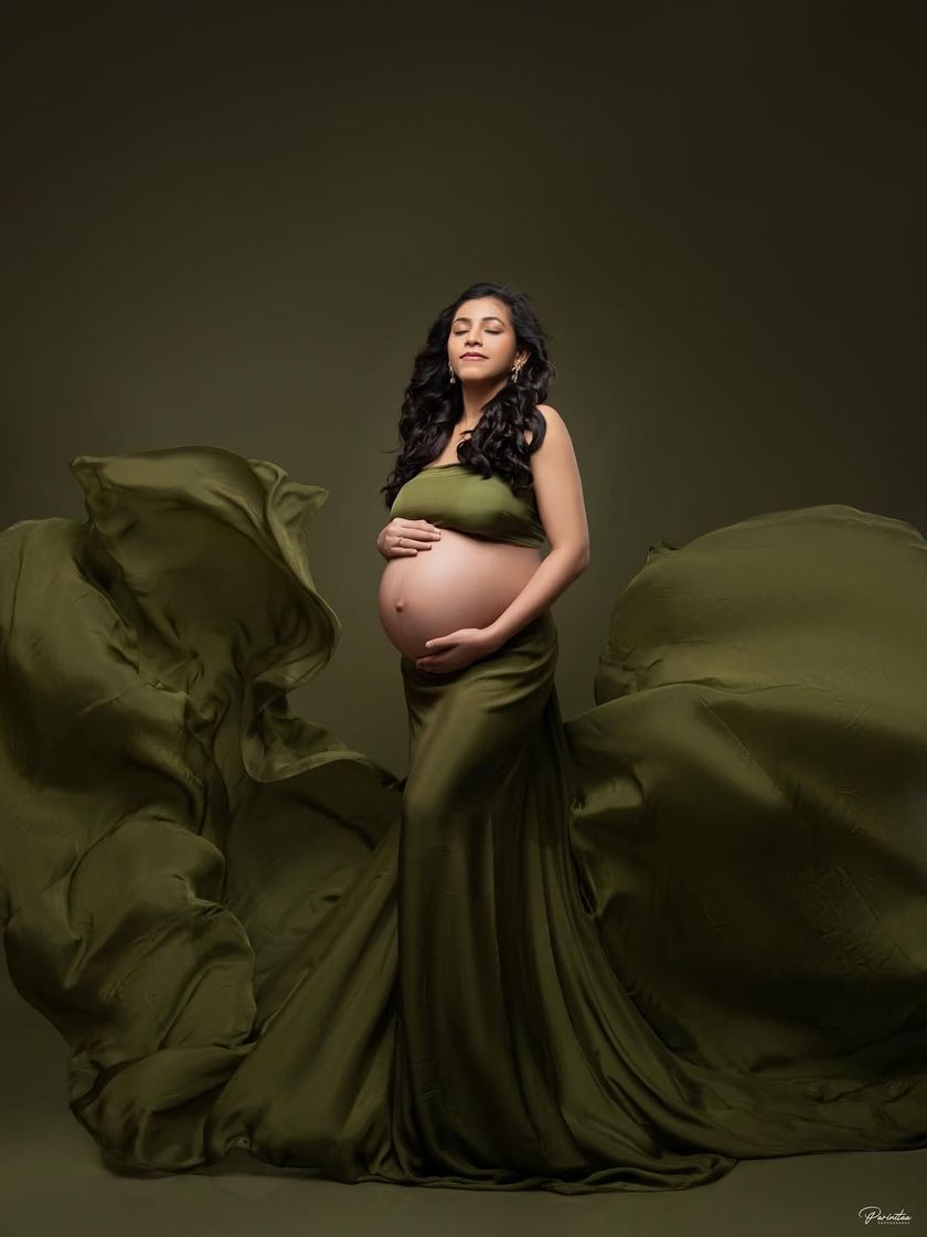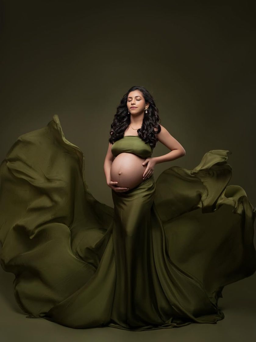 My studio sessions often feature dramatic gowns from my curated client wardrobe. These portraits are designed to be timeless works of art, using rich colors, flowing fabrics, and expert lighting to sculpt and celebrate your changing form. We offer a range of styles, from bold red and emerald green gowns to glamorous sequined dresses.