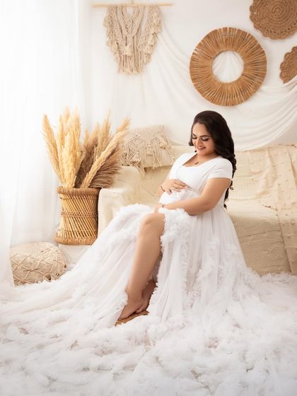 For a softer, more romantic feel, I offer a special boho-inspired setup in my Mumbai studio. Featuring natural textures like macrame and pampas grass, and paired with dreamy, ruffled gowns, these sessions produce light, airy, and whimsical portraits. This style is perfect for capturing a gentle and natural pregnancy glow.