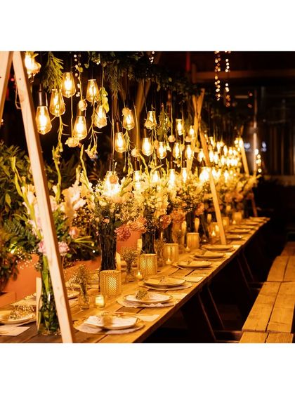 - “Blooms & Barrels” anniversaries: rustic dinner tables, hanging bulbs, a DIY bouquet bar (total hit with guests)