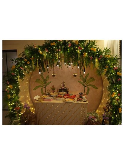 - For religious ceremony home decor, we do everything from lush Ganpati mandaps with marigolds and diyas to Godh Bharai with banana leaf backdrops and custom signs.