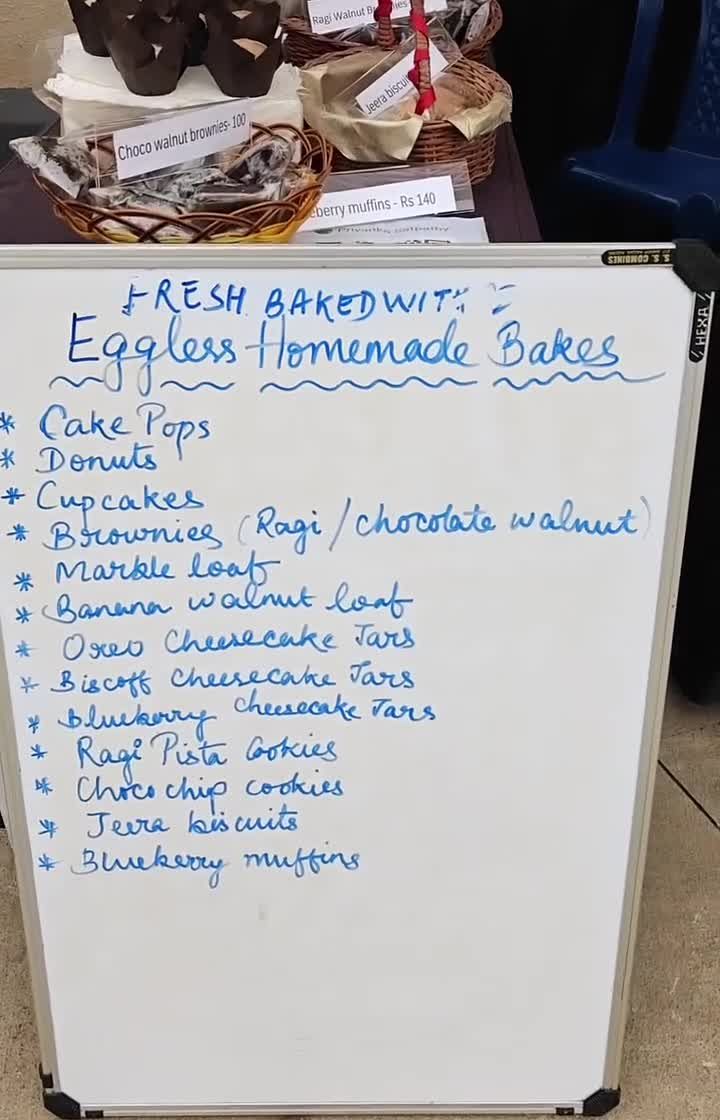 Come say hi when you see me at a local market. Here’s a look at my stall setup where I offer a wide range of fresh, homemade, and often eggless bakes like cookies, cake jars, and savory jeera biscuits. You can see my full menu of available treats on the day.