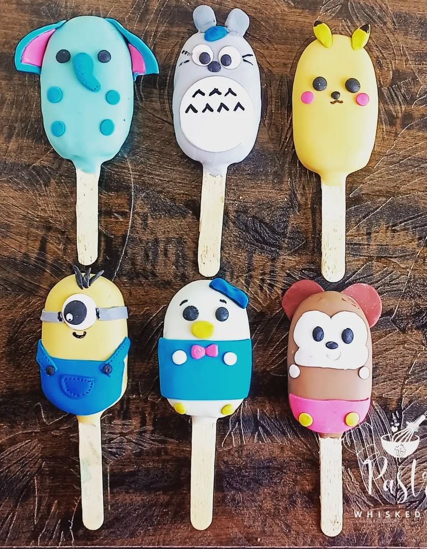 These are my popular cakesicles, which are like a cake pop but even better. They can be customized for any theme or occasion, from anniversaries and Women's Day to fun cartoon characters for kids' parties. I use both dark and white chocolate to create these little bites of joy.