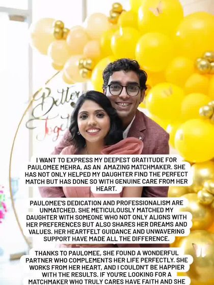 I believe the greatest measure of my success is the happiness of the couples I bring together. Here are some of the wonderful people who found their life partners through my personalized matchmaking process, along with their heartfelt words.