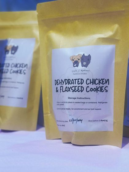 - Chicken & Flaxseed Cookies: Made with 100% minced chicken breast and roasted flaxseeds, dehydrated to a crunchy texture. Irregular, handmade shapes.