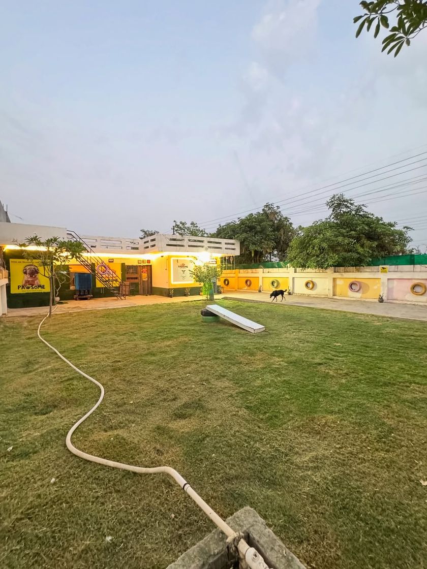 Welcome to our facility, designed for your dog's safety and happiness. We have a large, securely fenced grassy playground for outdoor fun, and clean, spacious, air-conditioned indoor rooms for rest and relaxation, especially during Delhi's hot afternoons.