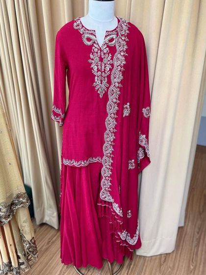 We specialize in creating bespoke bridal attire featuring intricate hand embroidery and premium fabrics like Banarsee silk and georgette. Our bridal collection includes customizable lehengas and sarees with detailed dabka work, katdana, and French knot embellishments.