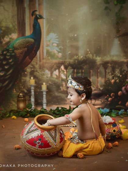 I bring the divine tales of Vrindavan to my studio for your little ones. These sessions are a celebration of innocence and culture, complete with peacock feathers, flutes, butter pots, and custom backdrops. Whether for a milestone or just for a beautiful memory, I create a playful space for your child to be their own little deity.