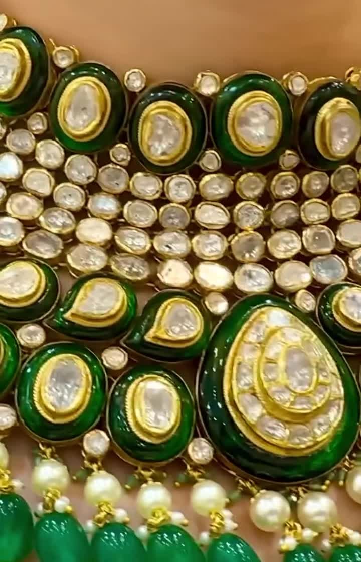 I craft these heritage Polki and Kundan sets for the bride who desires a royal look on her wedding day. Each piece is made with uncut diamonds and precious stones, set in hallmarked gold to create a timeless heirloom.