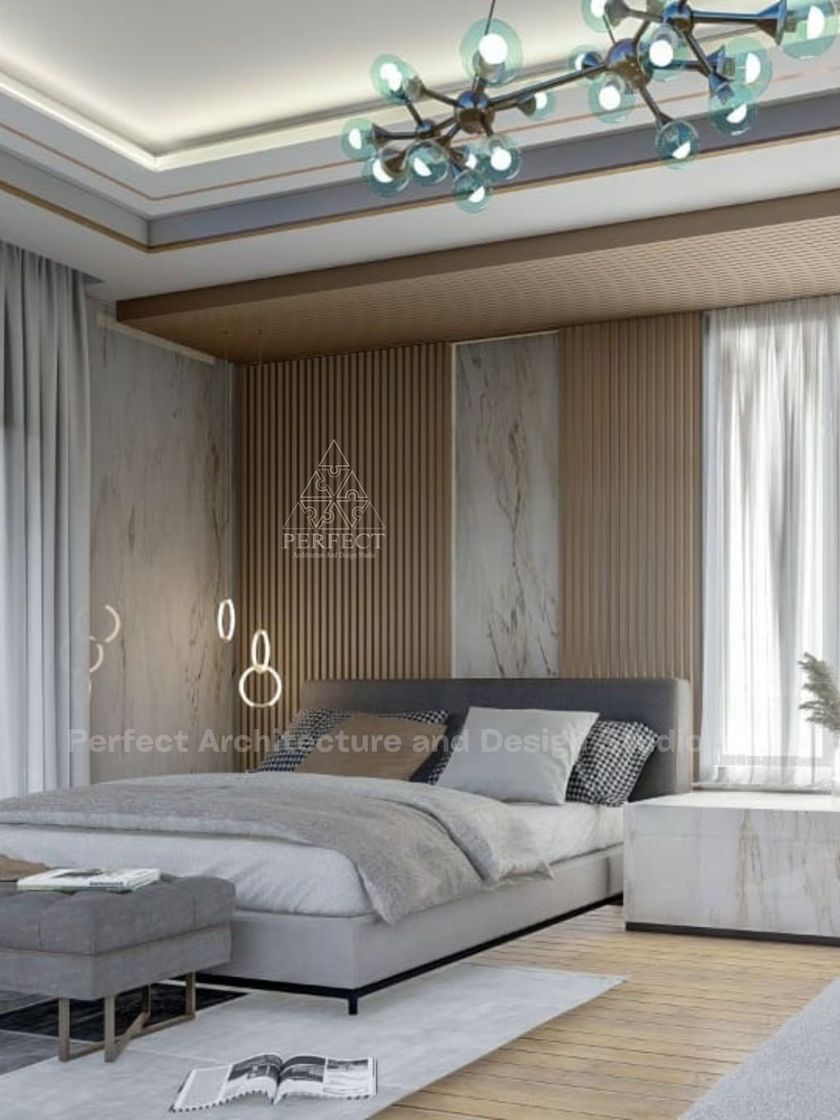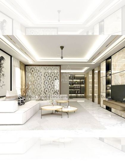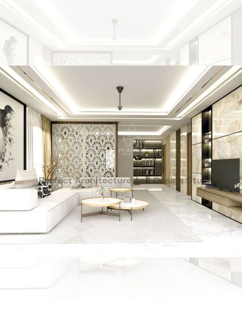 We design living areas that are both luxurious and functional, using a neutral color palette, rich textures like stone and marble, and custom furniture. Our designs often feature layered lighting and statement accent walls to create a sophisticated yet comfortable atmosphere.