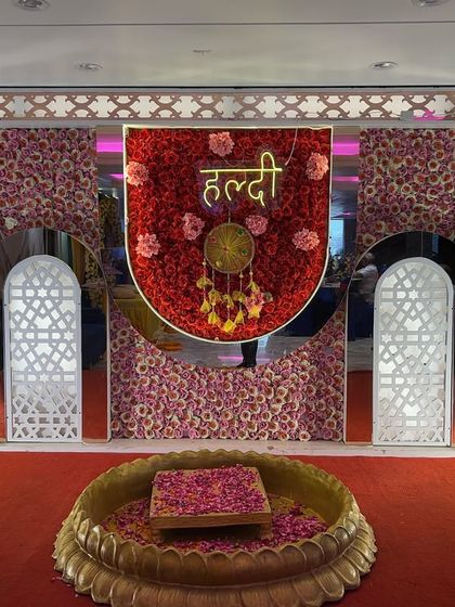 - Full stage and mandap setup - flowers, fabric, lighting, the works.