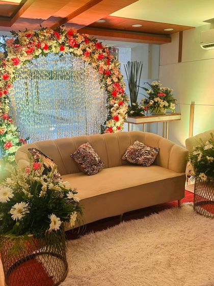 - Want something modern? I go with rose arrangements, pastel drapes, and elegant props - perfect for a clean, stylish engagement stage decoration.