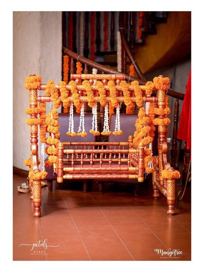 - Seating: Decorated traditional Jhula (Swing) with floral strings or heavy wooden antique chairs.
