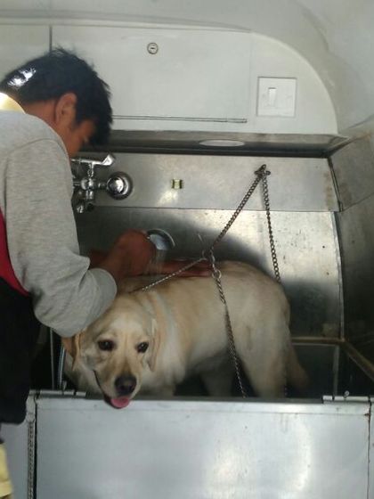 Take a peek inside our grooming van, a complete pet spa on wheels. We have a dedicated bathing tub with a gentle handheld shower and a secure space to ensure your dog is safe and comfortable throughout their session.