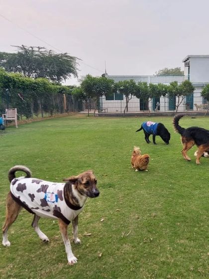 Cageless, Farm-Style Retreat - Yahan cages nahi, sirf khula maidan aur green space. Dogs free ghoomte hain, no stress.