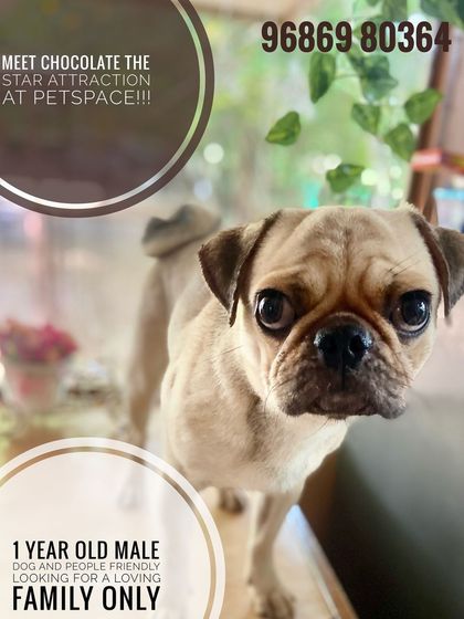 - Chocolate: 1-year-old Pug, playful and needs a cuddle partner.