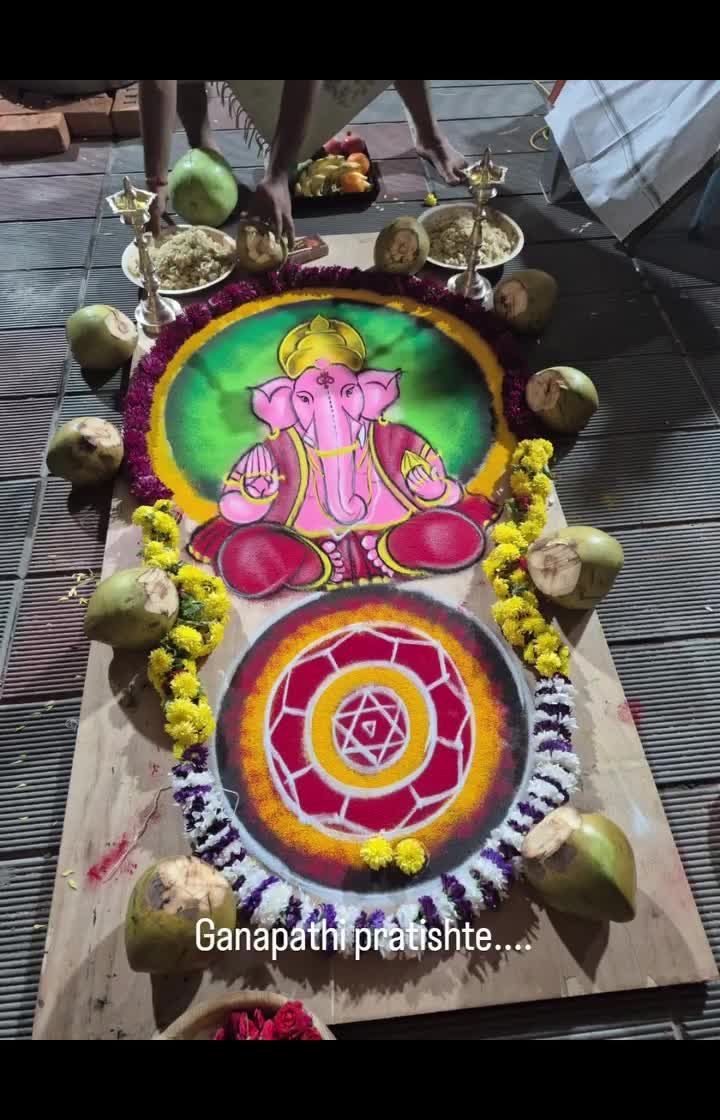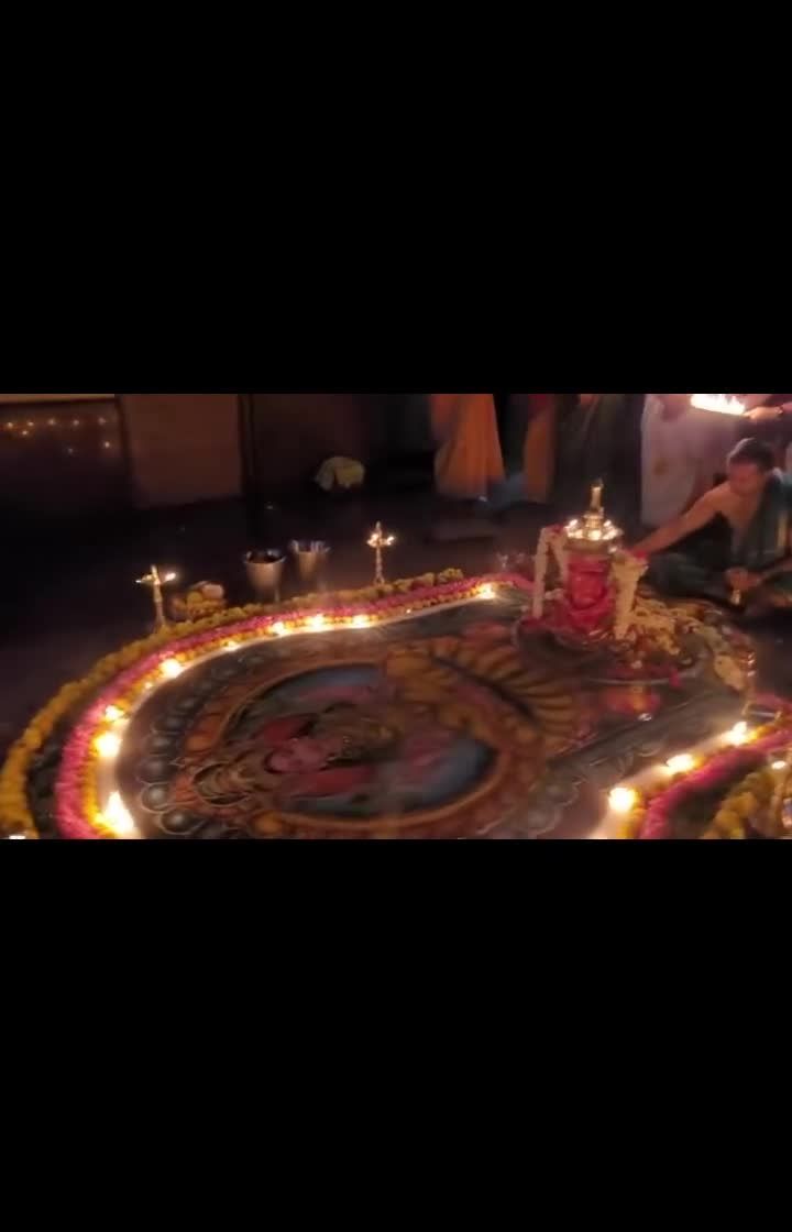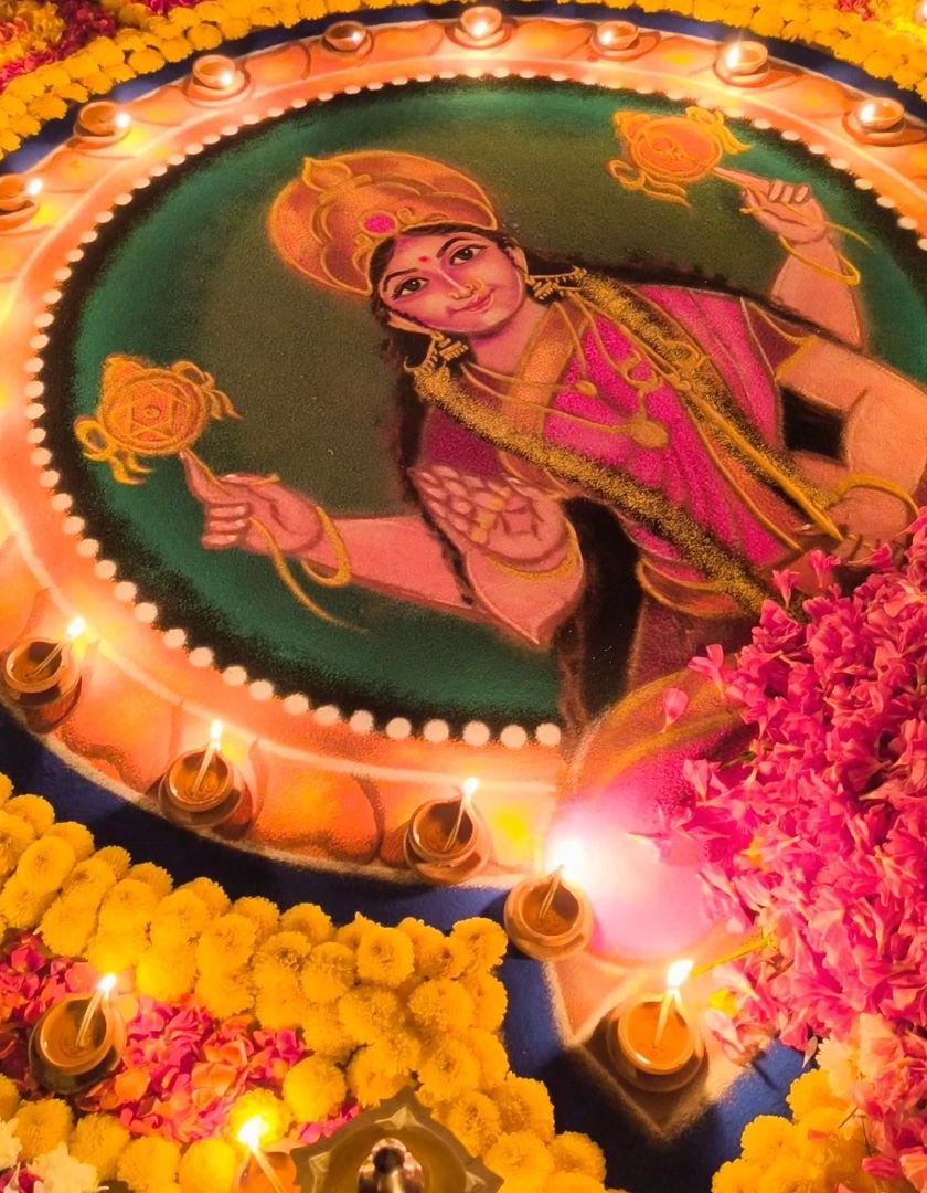 For me, creating a rangoli or mandala is a form of meditation and an offering in itself. Each design is carefully chosen for the specific ceremony, using vibrant colors and sacred geometry to invite divine energies and transform the space into a temple.