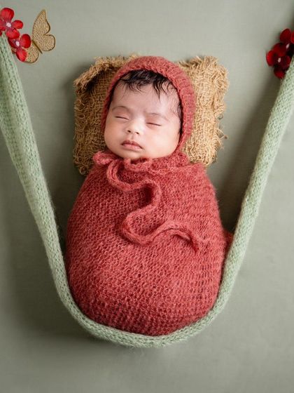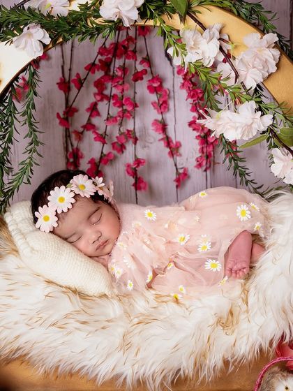 I do safe and comfortable newborn and baby photoshoots with custom themes, either in my Noida studio or at your home, and I adjust every session to your family’s needs.