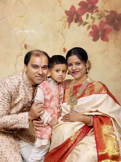 Our studio provides a comfortable, controlled environment for classic portraits. We offer sessions that range from artistic, Raja Ravi Varma inspired traditional shoots with elegant sarees to modern, relaxed family portraits with contemporary styling.