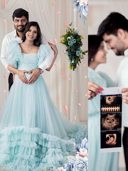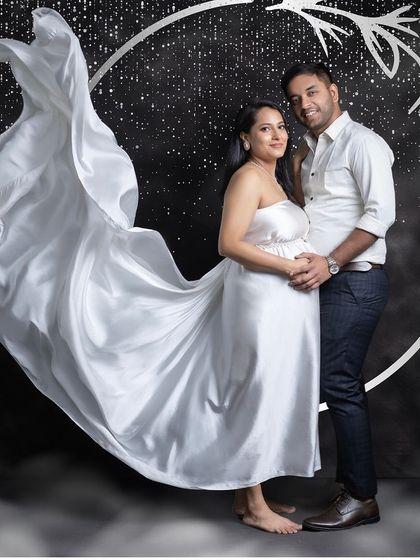 We offer maternity photoshoots in our Gurgaon studio with all-women staff, full wardrobe, makeup, props, and themed sets included so you just show up and choose your style.