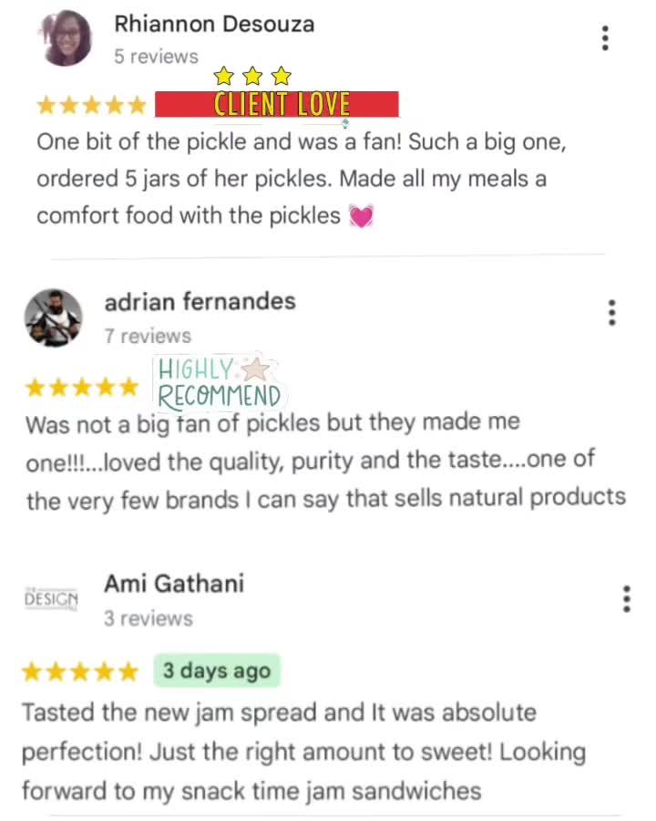 Nothing makes us happier than hearing from you. Here is a collection of reviews and feedback from our wonderful customers who love our homemade condiments as much as we love making them.
