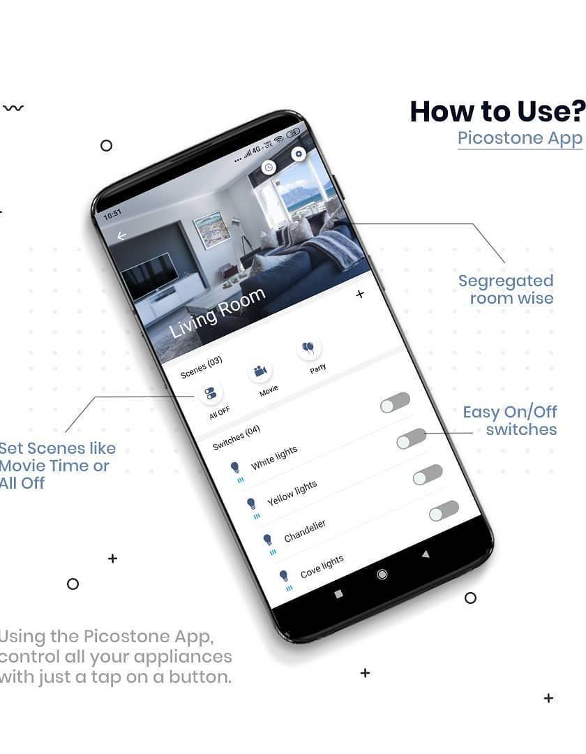 Your phone becomes the universal remote for your entire home. The Picostone app gives you complete control, room by room, whether you're at home or away. I'm also working on a new feature to help you track energy consumption.