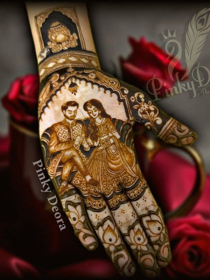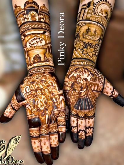 I design custom bridal mehndi with portraits, family stories, and personal details using my homemade organic mehndi with no chemicals.