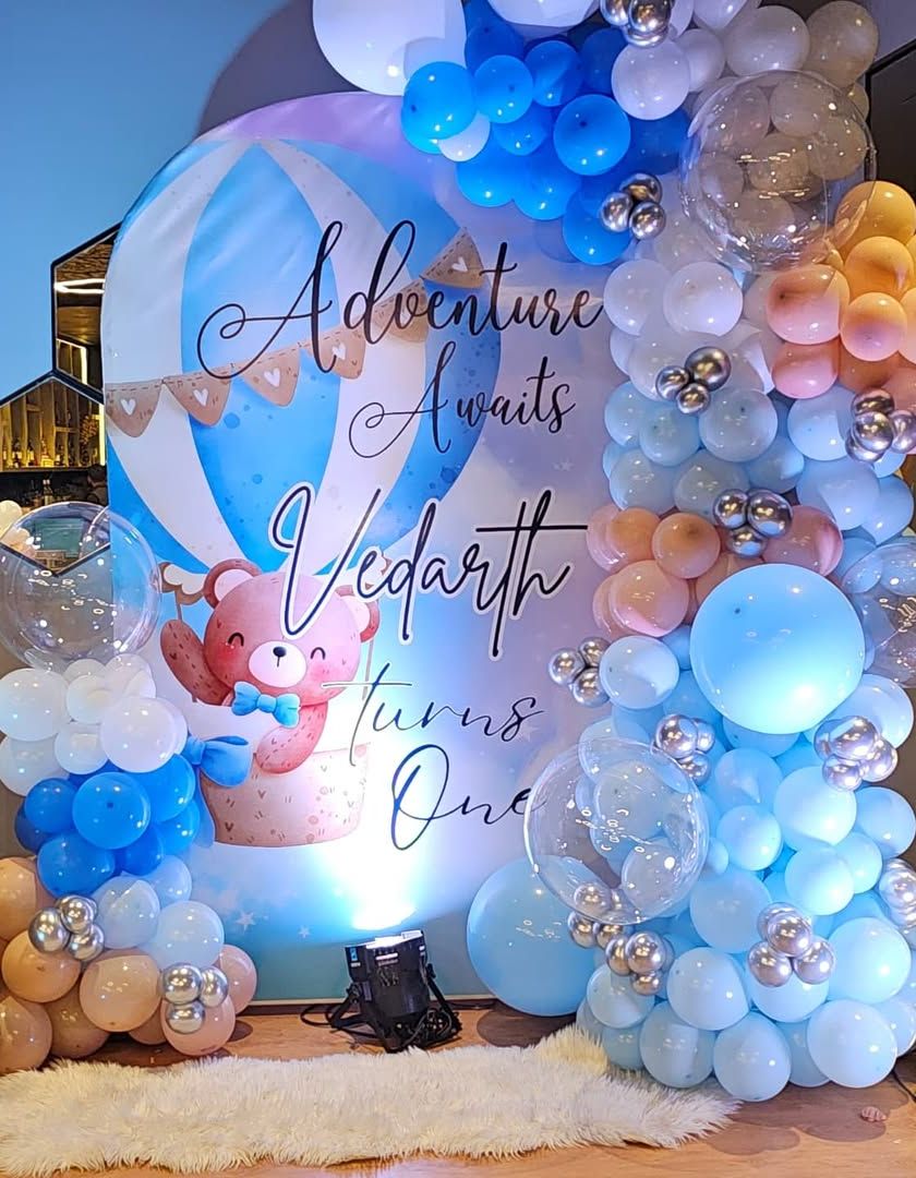 A baby's first birthday is a once-in-a-lifetime event, and I pour extra love into making it magical. I design adorable themes like 'Adventure Awaits' or 'Boss Baby', complete with custom backdrops, milestone photo boards, and special high-chair decorations for that perfect cake-smash moment.