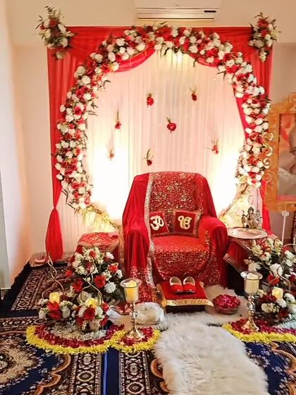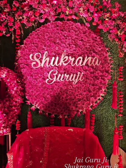 - Floral Decor: Fresh flowers everywhere. From “Shukrana Guruji” signs made of blooms to stage backdrops and entrance rangoli, floral work is my thing.