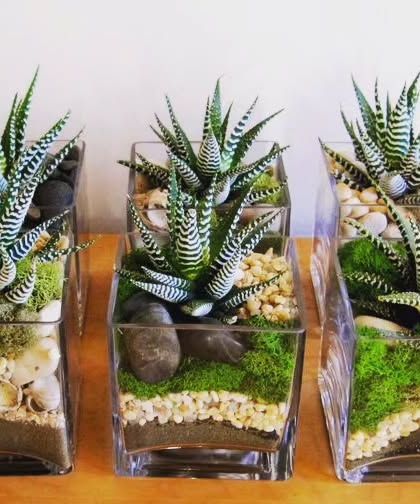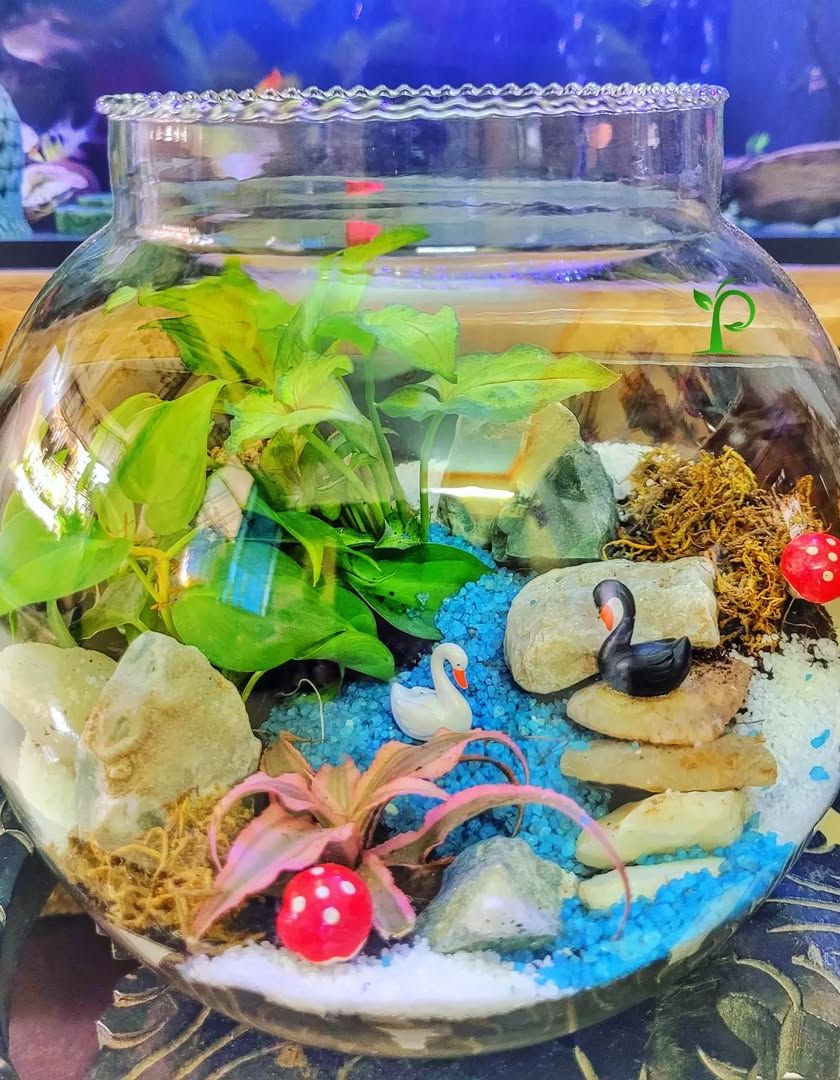 I create self-contained "jungles in a bowl" that make for a unique and lasting gift. These miniature ecosystems can be customized with different plants, colored sand, and personalized tags for any occasion, from birthdays to corporate desks.
