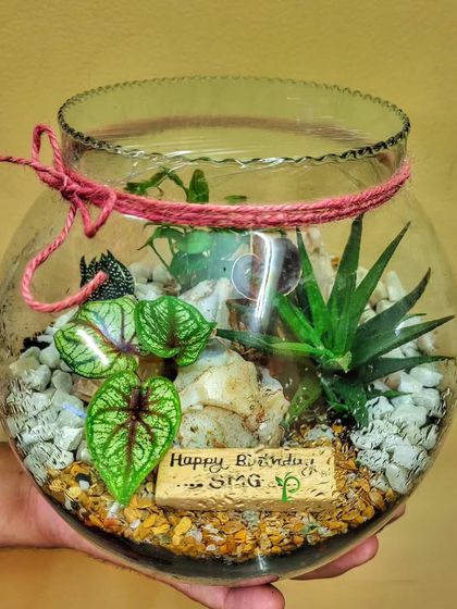I create self-contained "jungles in a bowl" that make for a unique and lasting gift. These miniature ecosystems can be customized with different plants, colored sand, and personalized tags for any occasion, from birthdays to corporate desks.