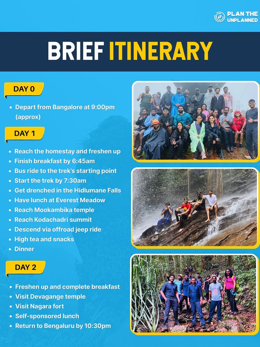 As the 10th highest peak in Karnataka, Kodachadri offers a complete adventure. The trail takes you through the dense Mookambika Wildlife Sanctuary, past the stunning Hidlumane Falls, and up to a temple thousands of years old, often shrouded in mystical monsoon clouds.