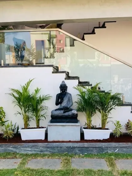 - Statement Pots: 3 to 4 large fiberglass or ceramic planters featuring specimen plants (e.g., Champa or Ficus).