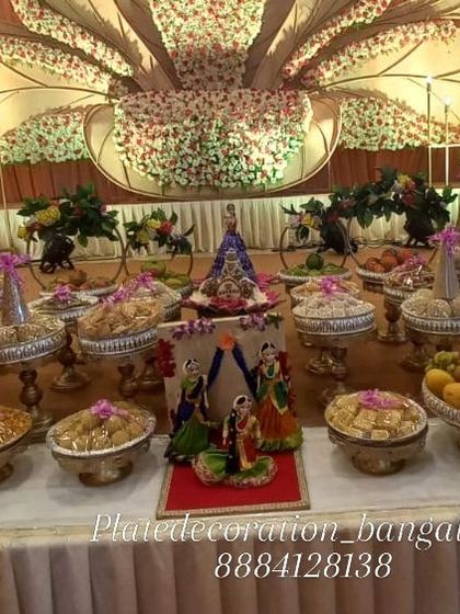 We specialize in creating authentic decorative setups for traditional Hindu ceremonies like Gowri Pooja and Saptapadi. Our services include intricate plate decorations using German silver plates, traditional figurines, and culturally appropriate floral arrangements.