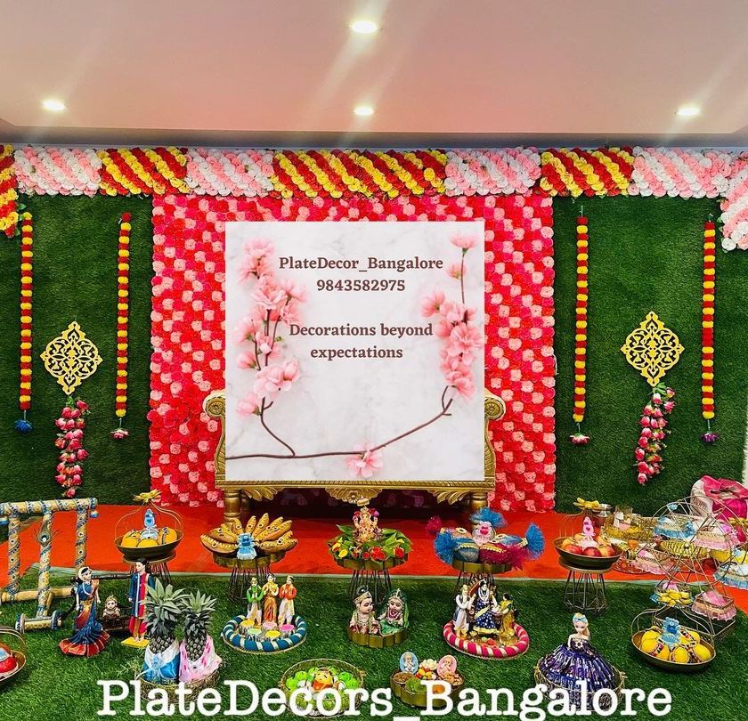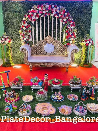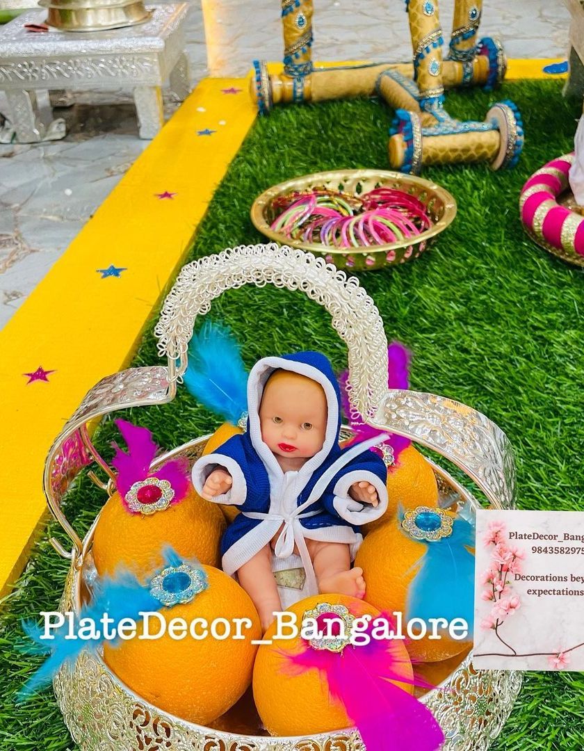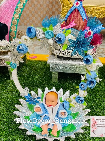I design adorable and creative platters perfect for celebrating a new arrival. Themes include cute baby dolls, pink and blue color schemes, and personalized elements for seemantham or baby shower functions.