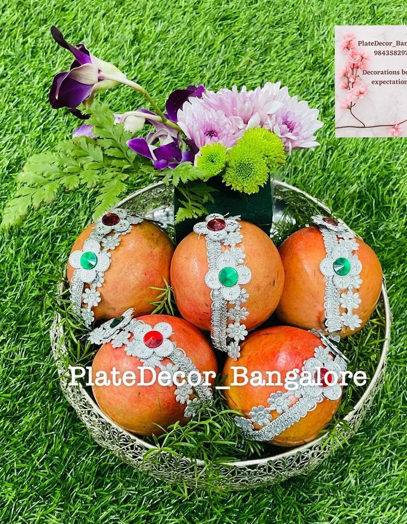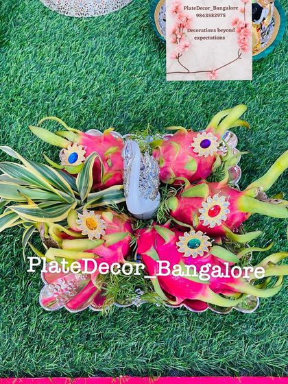 I turn fresh fruits into beautiful art pieces for your ceremony. I decorate a variety of fruits including apples, bananas, pomegranates, and dragon fruit using kundan work, intricate ribbons, and floral accents.