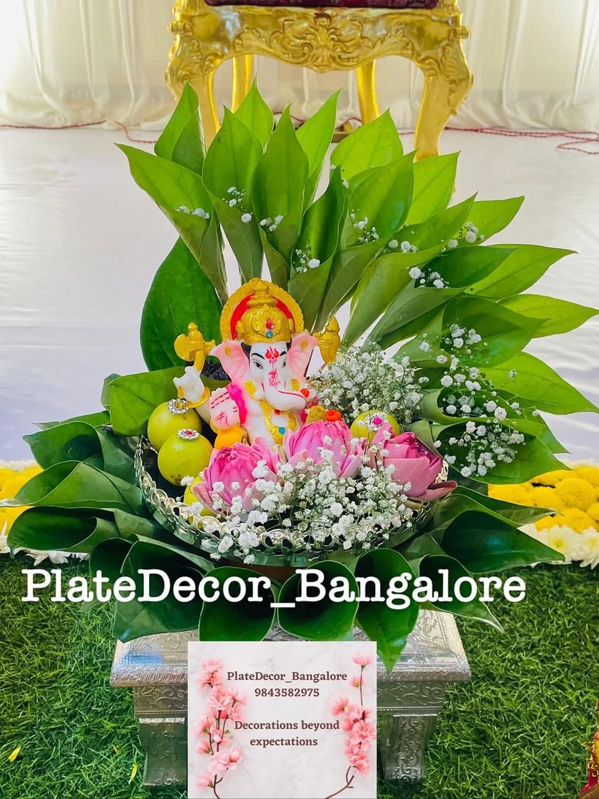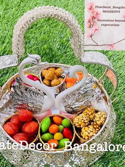 I prepare beautifully decorated platters for poojas, gruhapravesam, and other religious functions. These often feature deities like Ganesha or auspicious items like decorated coconuts with peacock feathers.