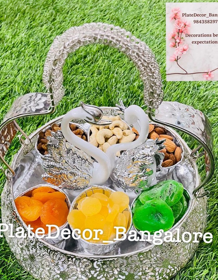 I arrange sweets, nuts, and dry fruits in elegant platters that are perfect for gifting. Designs range from traditional layouts to modern styles featuring decorative swan figurines.